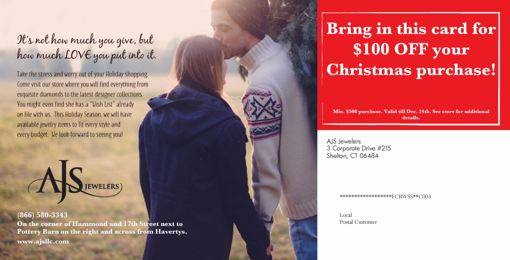 Wish your customers a “Merry Christmas” with this jumbo-sized postcard (5.5" x 11") that is proven to break-through the clutter and drive store traffic during this important sales period. Our program is all-inclusive and easy-to-execute because we do all the work for you for just one low price per EDDm piece. This professionally designed postcard has a 1,500 pcs. minimum print quantity and is printed on heavyweight #130 stock for a stronger feel. It is also customized with your own promotional offer to drive more Holiday purchases. With our turn-key EDDM program, you generate a targeted list based on select zip codes, postal carrier routes, or radius (miles) from any mailing address and we print, prepare all mail paperwork, and deliver to the USPS.